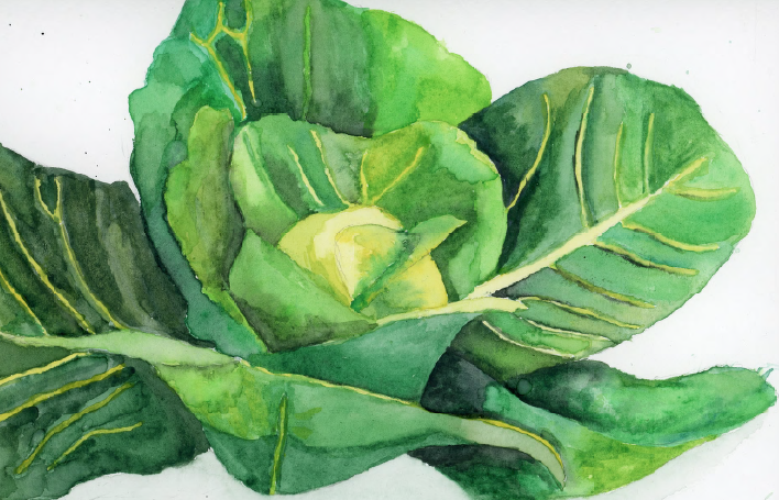 With inspiration from one of our student drawn Harvest of the Month paintings, we are highlighing one of the world’s oldest vegetables: Cabbage! As spring approaches, now is a great time to starting growing cabbage because it requires cooler weather.  Here are some planting tips for harvesting a beautiful head at home, like the one in the picture: