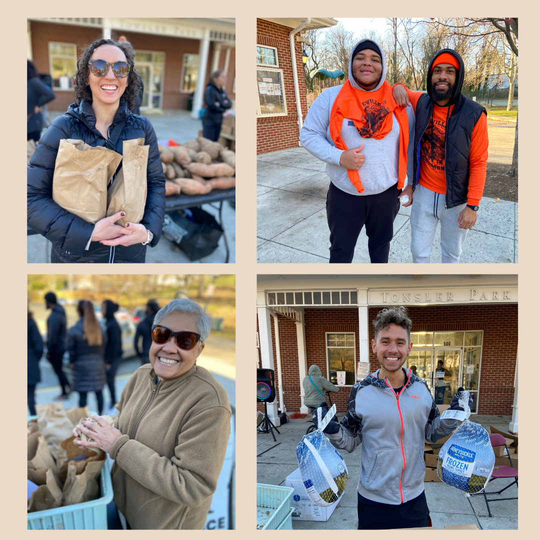 Top and bottom: Cultivate staff, Prolyfyck Run Creww, Uhuru Foundation, and other community members hand out turkeys and sweet potatoes at Tonsler Parl |